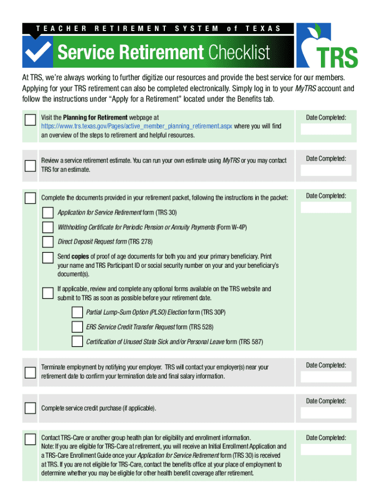 T E A C H E RR E T I R E M E N TS Y S T E Mo ft E × A Service Retirement Checklist At TRS, were always working to further digitize our resources and provide the best service for our members. Applying