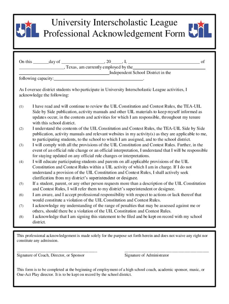 University Interscholastic League Professional Acknowledgement Form On this ___day of ___, 20___, I, ___ of ___, Texas, am currently employed by the Independent School District in the following capacity:.