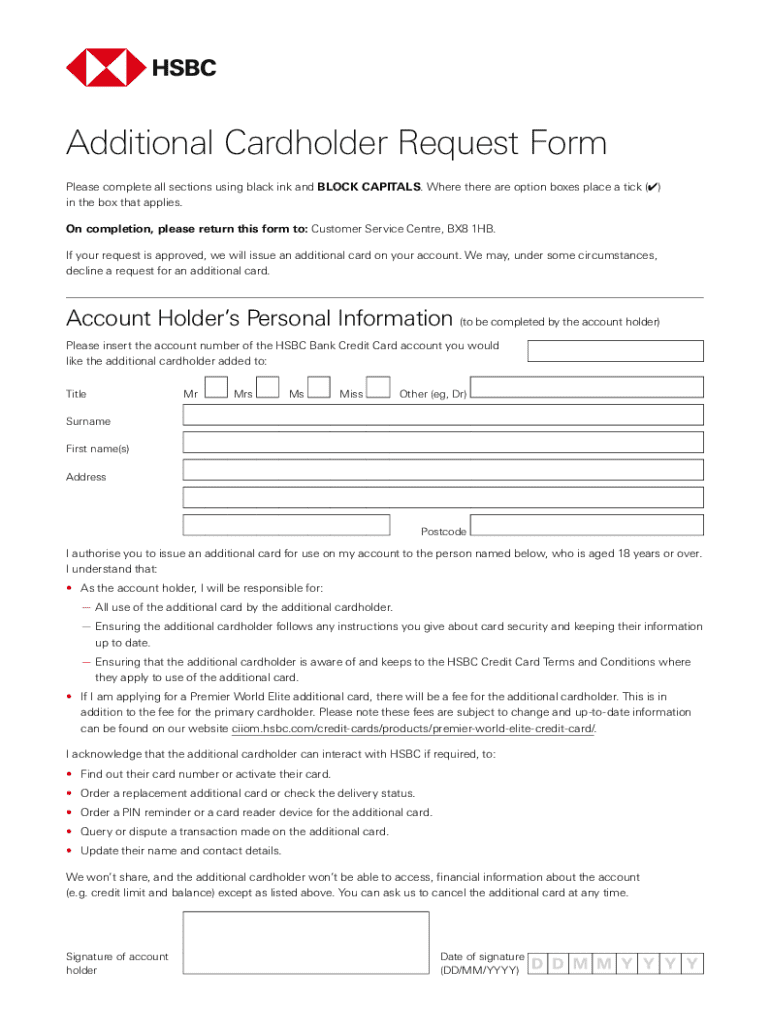 The form typically requires information such as the name, contact information, and relationship to the primary cardholder of the additional cardholder.