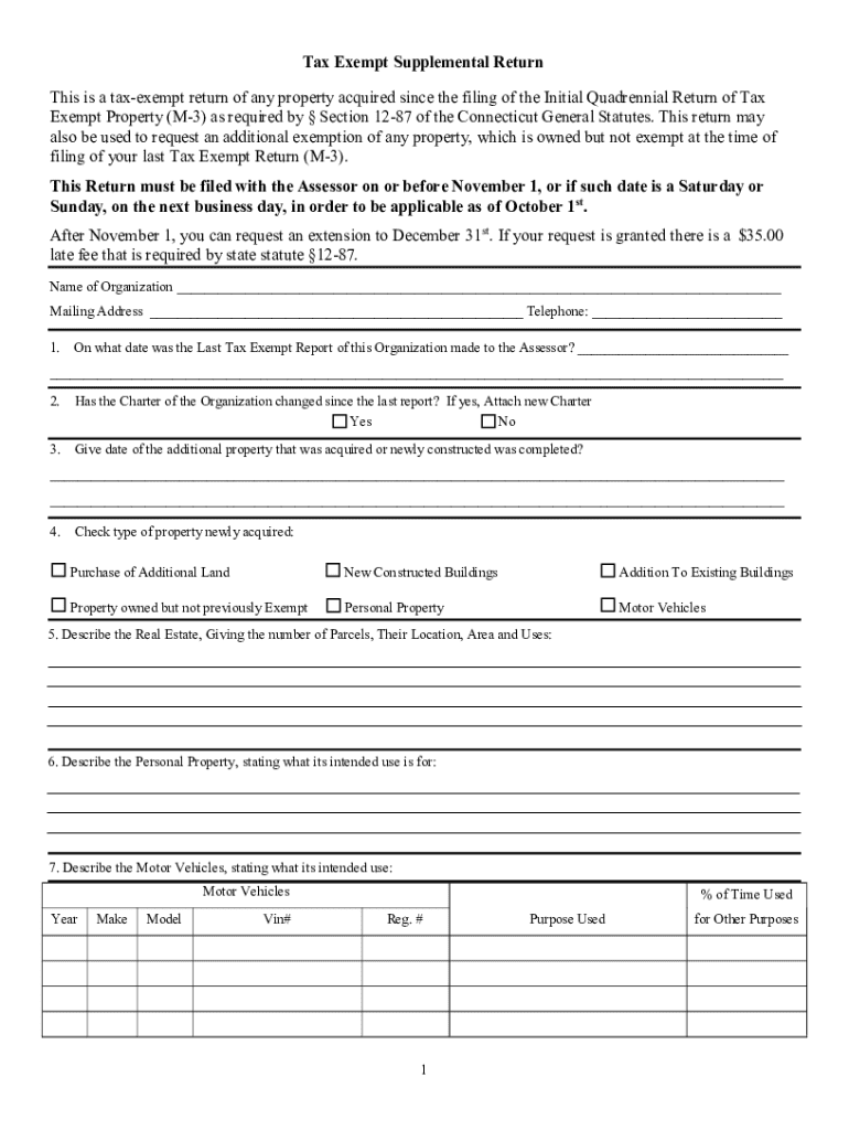 Tax Exempt Supplemental Return This is a tax exempt return of any property acquired since the filing of the Initial Quadrennial Return of Tax Exempt Property (M3) as required by Section 1287 of the