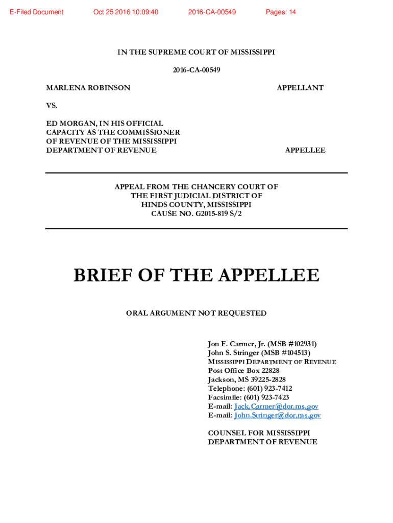 EFiled DocumentOct 25 2016 10:09:402016CA00549Pages: 14IN THE SUPREME COURT OF MISSISSIPPI 2016CA00549 MARLENA ROBINSONAPPELLANTVS. ED MORGAN, IN HIS OFFICIAL CAPACITY AS THE COMMISSIONER OF REVENUE