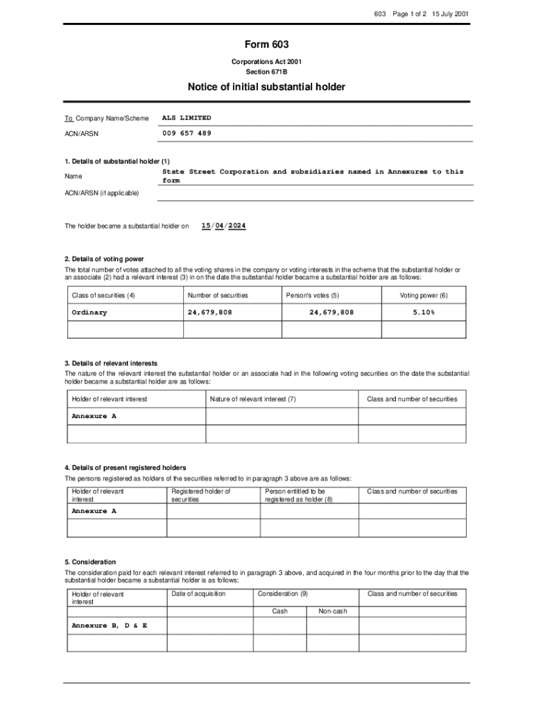 603Page 1 of 2 15 July 2001Form 603 Corporations Act 2001 Section 671BNotice of initial substantial holder To Company Name/Scheme ALS LIMITED ACN/ARSN009 657 4891. Details of substantial holder (1)