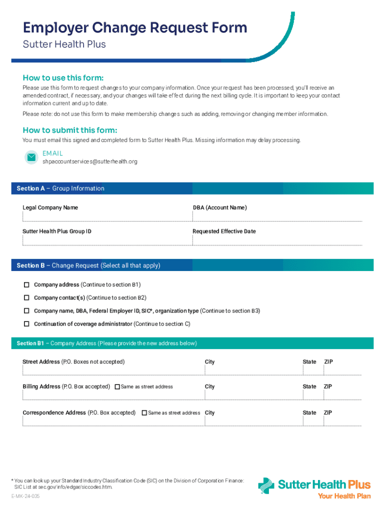 Employer Change Request Form Sutter Health Plus How to use this form: Please use this form to request changes to your company information. Once your request has been processed, you\'ll receive an