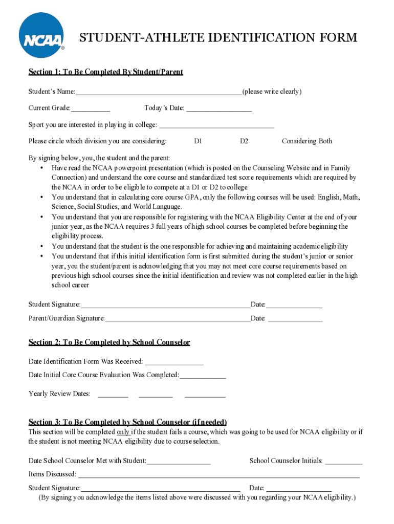 STUDENTATHLETE IDENTIFICATION FORM Section 1: To Be Completed By Student/Parent Students Name: Current Grade:(please write clearly) Today's Date:Sport you are interested in playing in college: Please