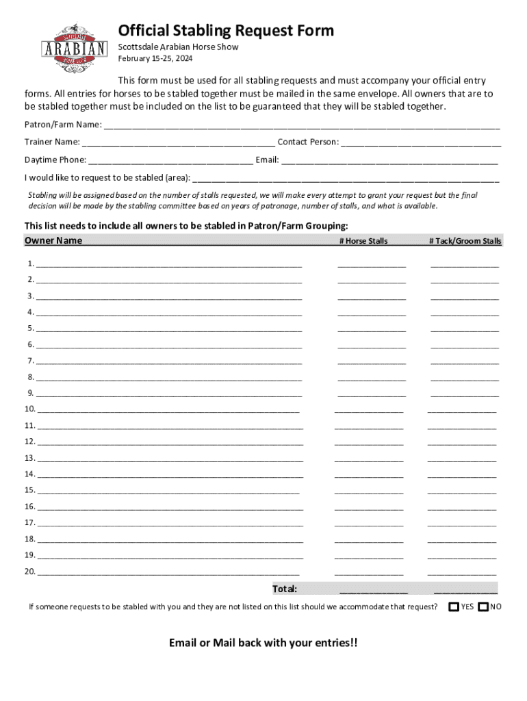 Official Stabling Request Form Scottsdale Arabian Horse Show February 1525, 2024This form must be used for all stabling requests and must accompany your official entry forms. All entries for horses