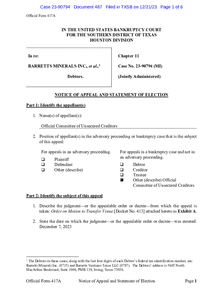 Case 2390794 Document 487 Filed in TSB on 12/21/23-Page 1 of 6 Official Form 417AIN THE UNITED STATES BANKRUPTCY COURT FOR THE SOUTHERN DISTRICT OF TEXAS HOUSTON DIVISION In re:Chapter 11BARRETTS