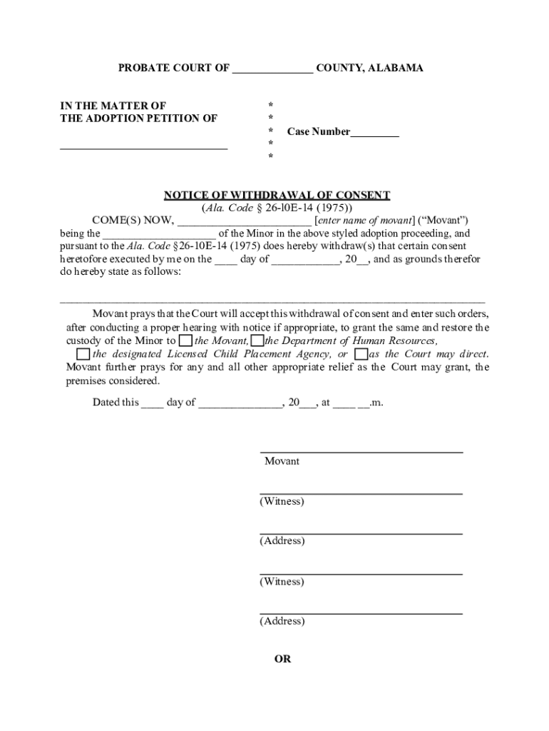 Get the free Notice of Withdrawal of Consent - eforms alacourt