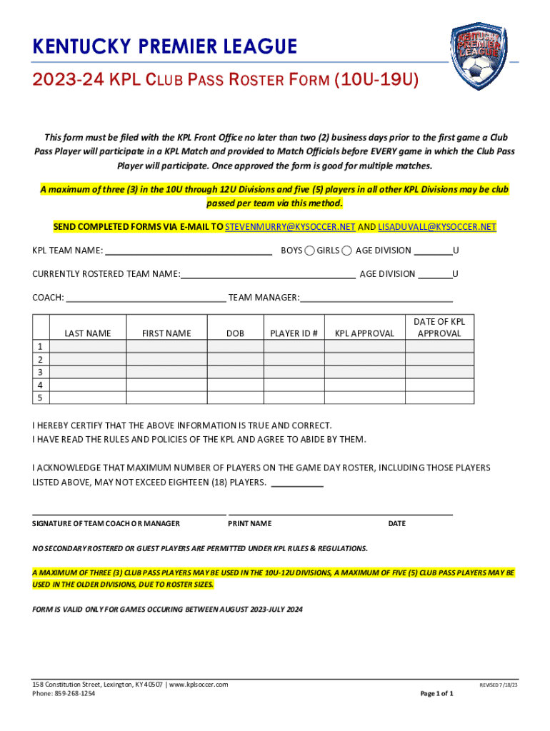 KENTUCKY PREMIER LEAGUE 202324 KPL C LUB P ASS R OSTER F ORM (10U19U) This form must be filed with the KPL Front Office no later than two (2) business days prior to the first game a Club Pass Player