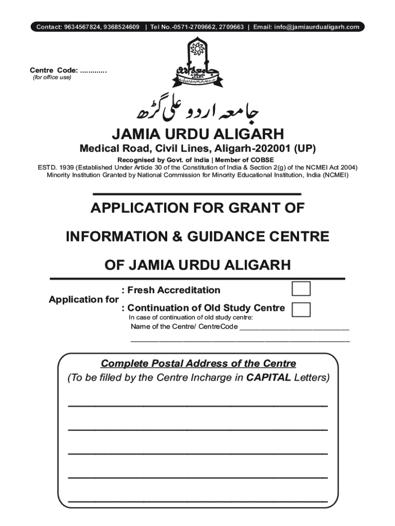 Contact: 9634567824, 9368524609 | Tel No.05712709662, 2709663 | Email: info@jamiaurdualigarh.comCentre Code: ............. (for office use)JAMIE URDU ALIGARH Medical Road, Civil Lines, Aligarh202001
