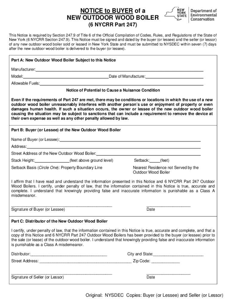 NOTICE to BUYER of a NEW OUTDOOR WOOD BOILER (6 NYCRR Part 247) This Notice is required by Section 247.9 of Title 6 of the Official Compilation of Codes, Rules, and Regulations of the State of New