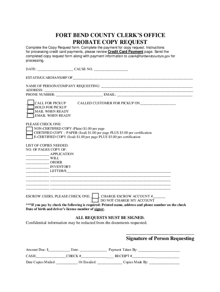 FORT BEND COUNTY CLERKS OFFICE PROBATE COPY REQUEST Complete the Copy Request form. Complete the payment for copy request. Instructions for processing credit card payments, please review Credit Card
