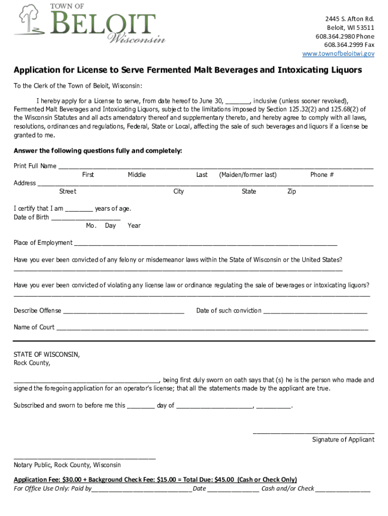 2445 S. Anton Rd. Beloit, WI 53511 608.364.2980 Phone 608.364.2999 Fax www.townofbeloitwi.govApplication for License to Serve Fermented Malt Beverages and Intoxicating Liquors To the Clerk of the