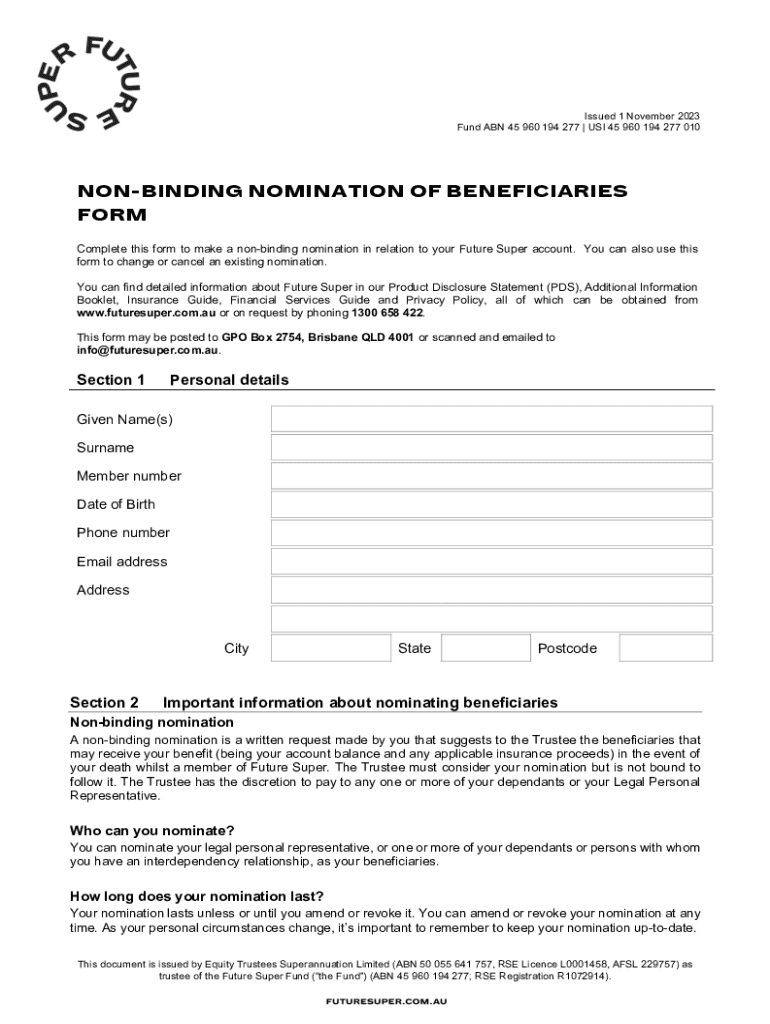 Issued 1 November 2023 Fund ABN 45 960 194 277 | USI 45 960 194 277 010NONBINDING NOMINATION OF BENEFICIARIES FORM Complete this form to make a nonbinding nomination in relation to your Future Super