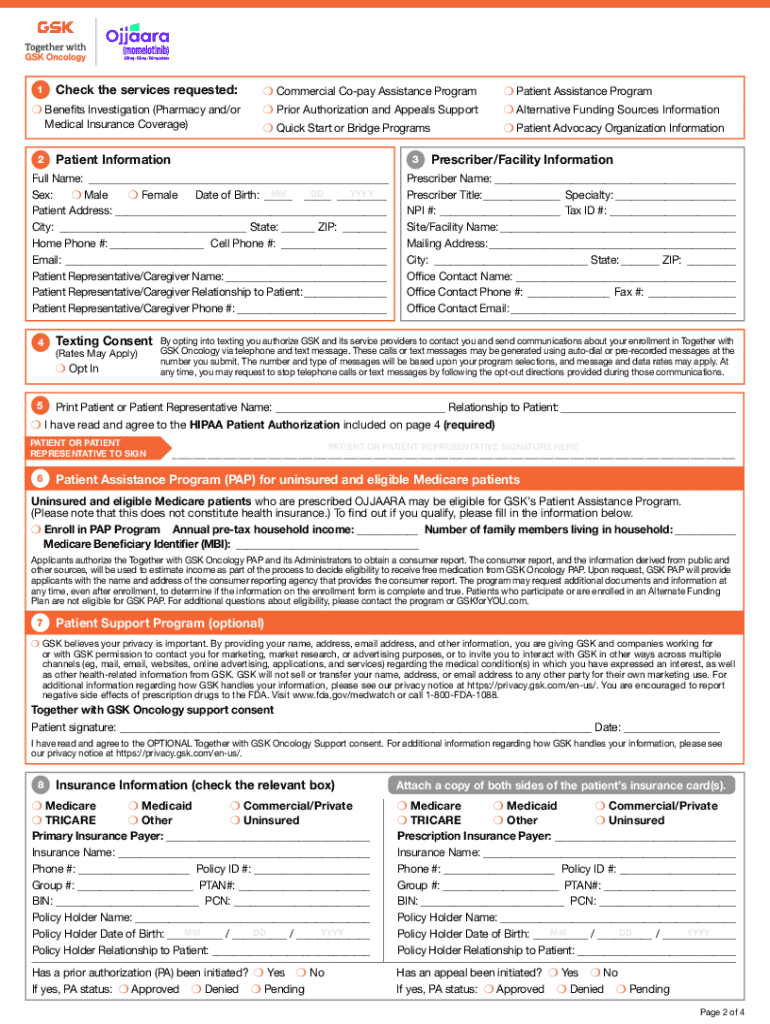 Together with GSK Oncology Enrollment Form Fax completed enrollment form to 18006459043 For assistance, please call 18444GSKONC Monday Friday (8 AM to 8 PM ET)Visit us at www.TogetherwithGSKOncology.comImportant