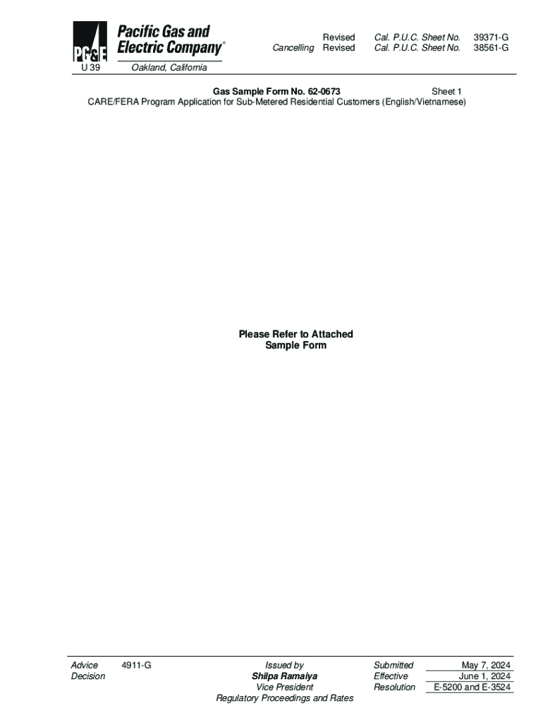 Cancelling U 39Revised RevisedCal. P.U.C. Sheet No. Cal. P.U.C. Sheet No.39371G 38561GOakland, CaliforniaGas Sample Form No. 620673 Sheet 1 CARE/FERA Program Application for SubMetered Residential