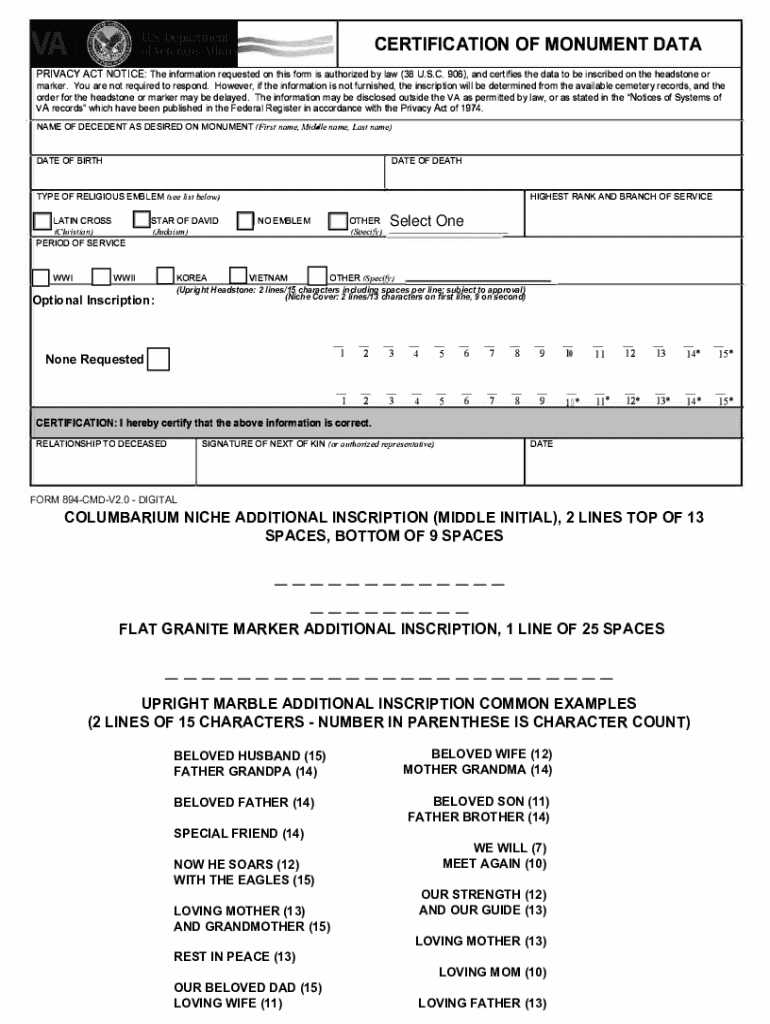 The va monument form requires information such as the veteran's name, date of birth, date of death, and details about the grave marker or headstone.
