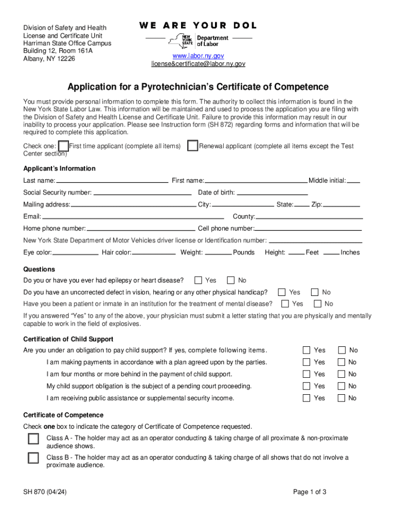 Division of Safety and Health License and Certificate Unit Harriman State Office Campus Building 12, Room 161A Albany, NY 12226www.labor.NY.gov license&certificate@labor.ny.govApplication for a Pyrotechnics