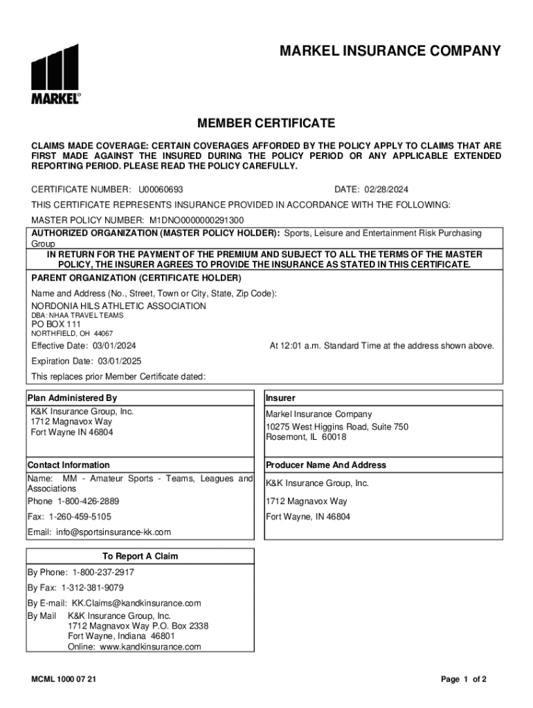 MARKET INSURANCE COMPANYMEMBER CERTIFICATE CLAIMS MADE COVERAGE: CERTAIN COVERAGES AFFORDED BY THE POLICY APPLY TO Claim THAT ARE FIRST MADE AGAINST THE INSURED DURING THE POLICY PERIOD OR ANY APPLICABLE