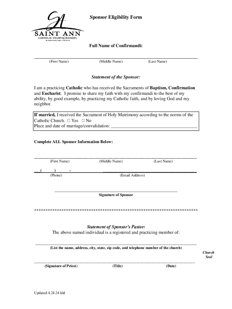 Get the free Sponsor Eligibility Form - St. Ann Catholic Church