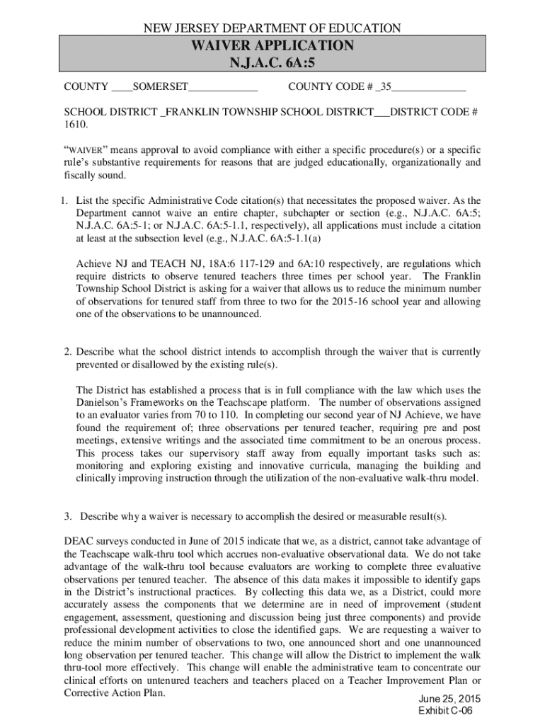 NEW JERSEY DEPARTMENT OF EDUCATIONWAIVER APPLICATION N.J.A.C. 6A:5 COUNTY ___SOMERSET___COUNTY CODE # _35___SCHOOL DISTRICT _FRANKLIN TOWNSHIP SCHOOL DISTRICT___DISTRICT CODE # 1610. WAIVER means