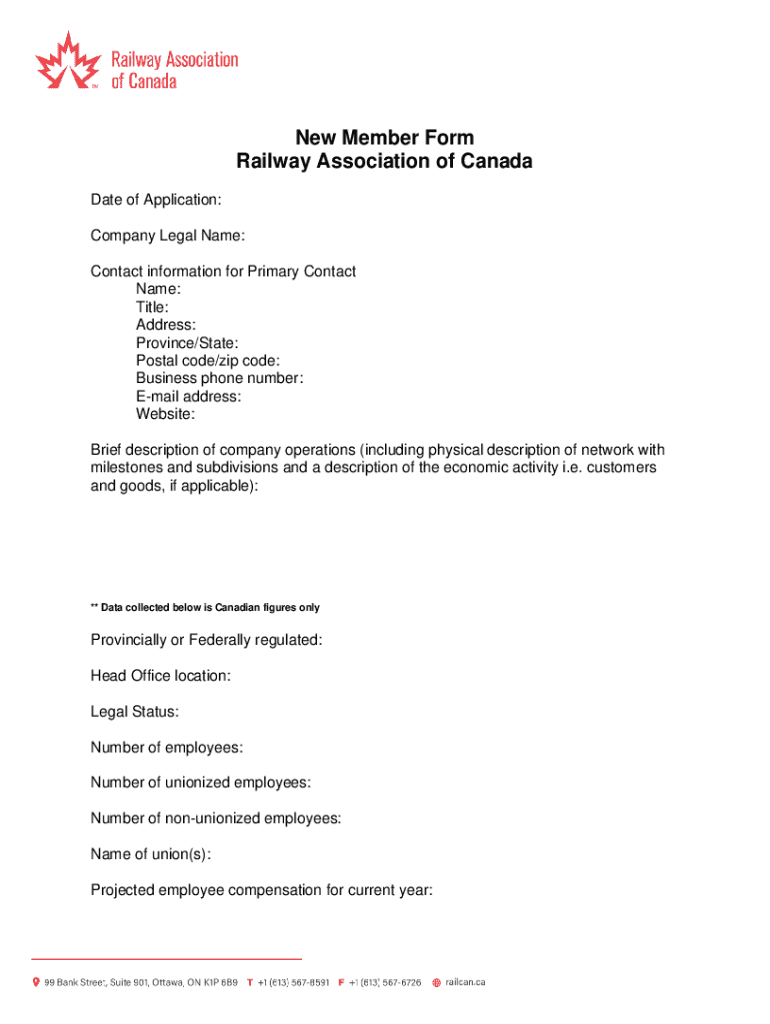 New Member Form Railway Association of Canada Date of Application: Company Legal Name: Contact information for Primary Contact Name: Title: Address: Province/State: Postal code/zip code: Business