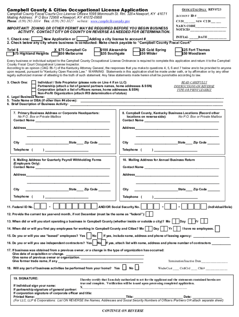 Campbell County & Cities Occupational License ApplicationOFFICE USE ONLY REV0723Campbell County Fiscal Court Occ License Office 1098 Monmouth St. Rm. 320 Newport, KY 41071 Mailing Address: P O Box