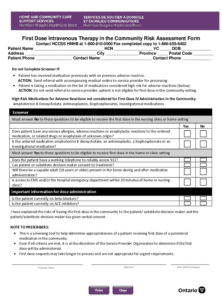 First Dose Intravenous Therapy in the Community Risk Assessment Form Contact HCC SS HUB at 18008100000 Fax completed copy to 18666556402 Patient Name ___ HAN ___ VC ___ DOB ___ Address ___ City ___