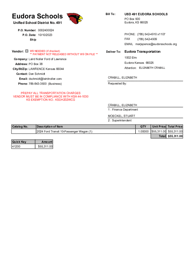 Eudora Schools Bill To:USD 491 EUDORA SCHOOLS PO Box 500 Eudora, KS 66025Unified School District No. 491 P.O. Number: 0002400024PHONE: (785) 5424910 x1107P. O. Date: 10/10/2023FAXShip(785) 5424909EMAIL