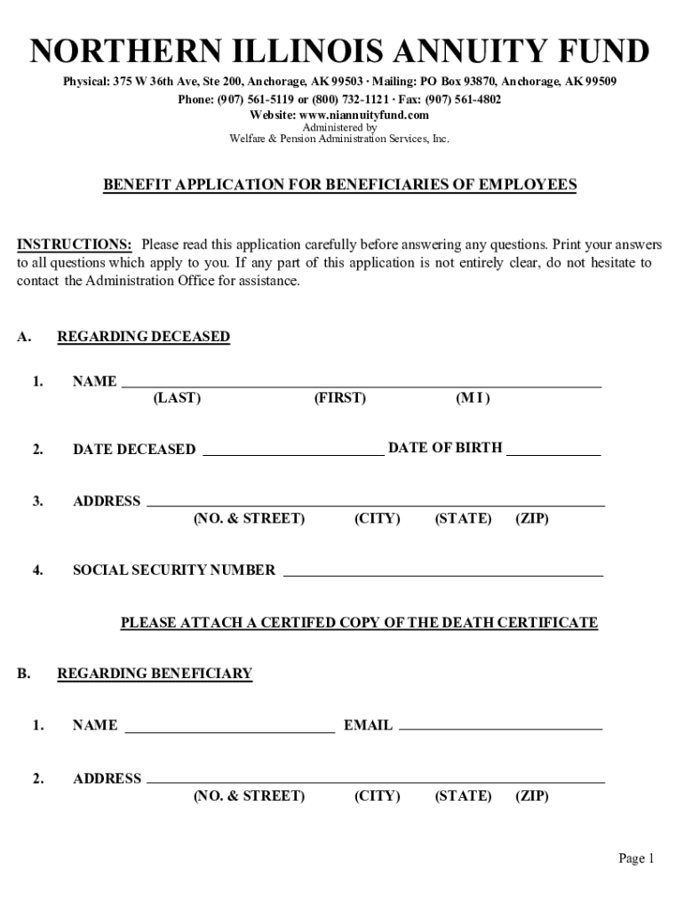 NORTHERN ILLINOIS ANNUITY FUND Physical: 375 W 36th Ave, Ste 200, Anchorage, AK 99503 Mailing: PO Box 93870, Anchorage, AK 99509 Phone: (907) 5615119 or (800) 7321121 Fax: (907) 5614802 Website: www.niannuityfund.com