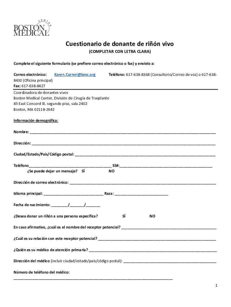 Cuestionario de donante de rin vivo (COMPLETAR CON LETRA CLARA) Complete el siguiente formulario (se prefiere correo electrnico o fax) y envelo a: Correo electrnico: Karen.Curreri@bmc.org 8430 (Oficina