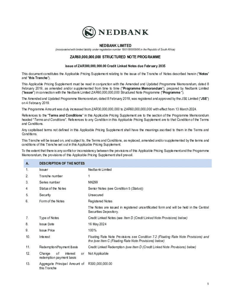 NEDBANK LIMITED(incorporated with limited liability under registration number 1951/000009/06 in the Republic of South Africa)ZAR60,000,000,000 STRUCTURED NOTE PROGRAMME issue of ZAR300,000,000.00