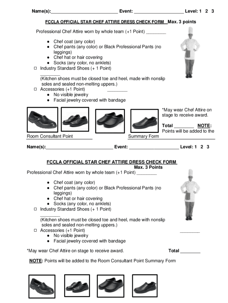 Name(s):___ Event: ___ Level: 1 2 3 FCCLA OFFICIAL STAR CHEF ATTIRE DRESS CHECK FORM Max. 3 pointsProfessional Chef Attire worn by whole team (+1 Point) ___ Chef coat (any color) Chef pants (any color)