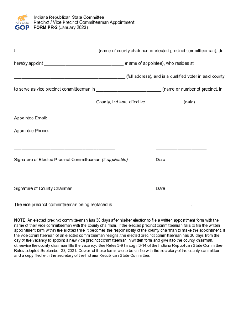 Indiana Republican State Committee Precinct / Vice Precinct Committeeman Appointment FORM PR2 (January 2023)I, ___ (name of county chairman or elected precinct committeeman), do hereby appoint ___