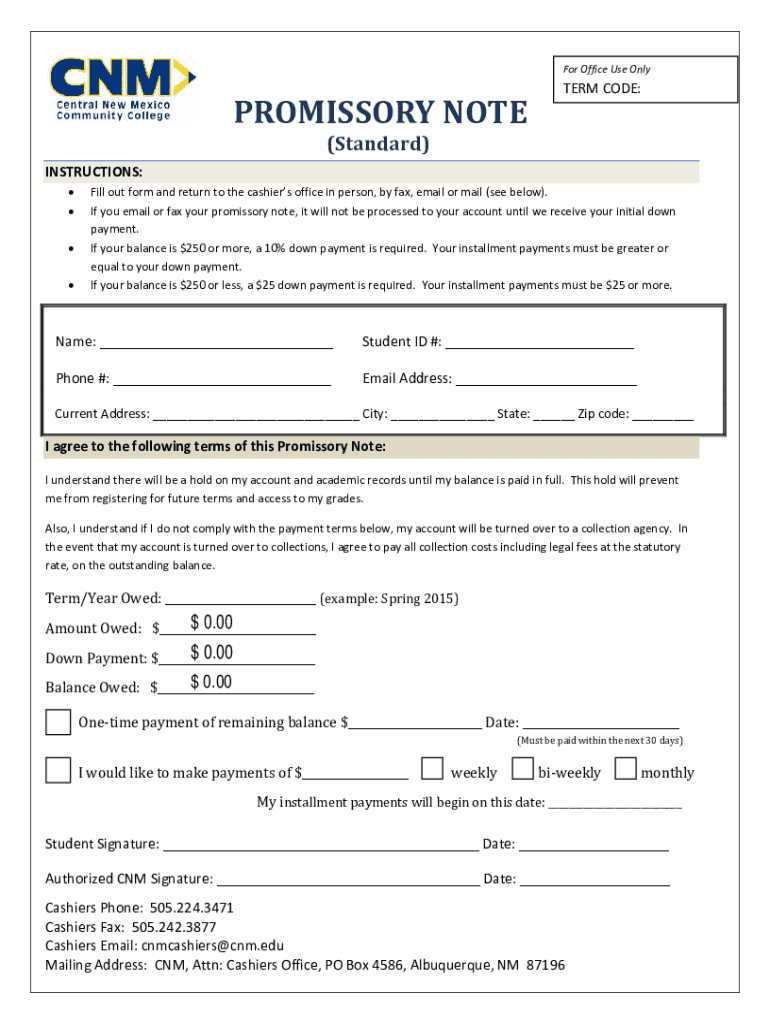 For Office Use OnlyPROMISSORY POTTERY CODE:(Standard)INSTRUCTIONS: Fill out form and return to the cashiers' office in person, by fax, email or mail (see below). If you email or fax your promissory