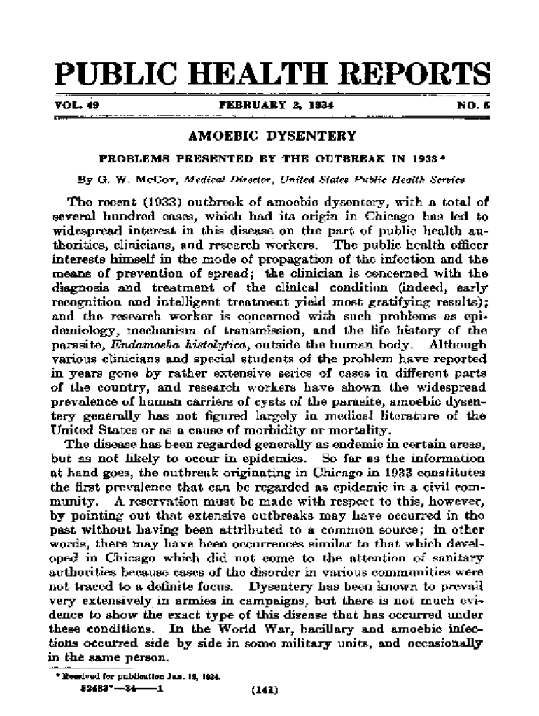 PUBLIC HEALTH REPORTS VOL 49FEBRUARY 2, 1934NO. 5AMOEBIC DYSENTERY PROBLEMS PRESENTED BY THE OUTBREAK IN $1933 By G. W. McCoy, Medical Director, United States Public Health Serviette recent (1933)