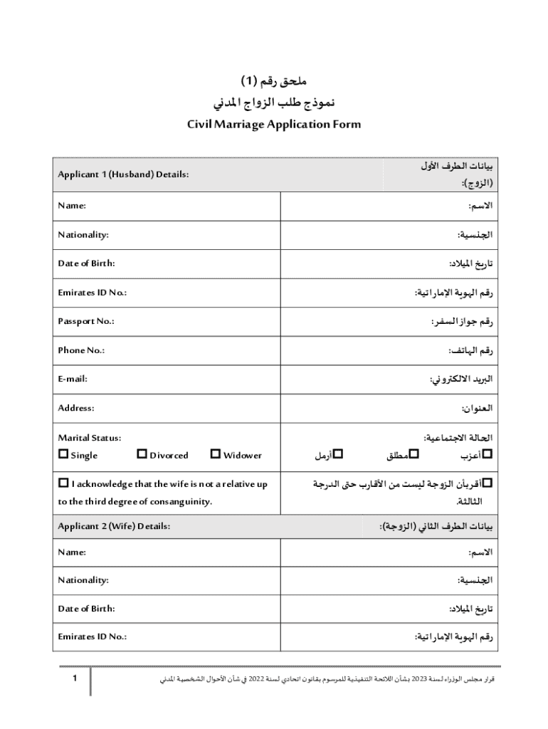 ()1 Civil Marriage Application Form ():Applicant 1 (Husband) Details: Name::Nationality::Date of Birth: :Emirates ID No.: :Passport No