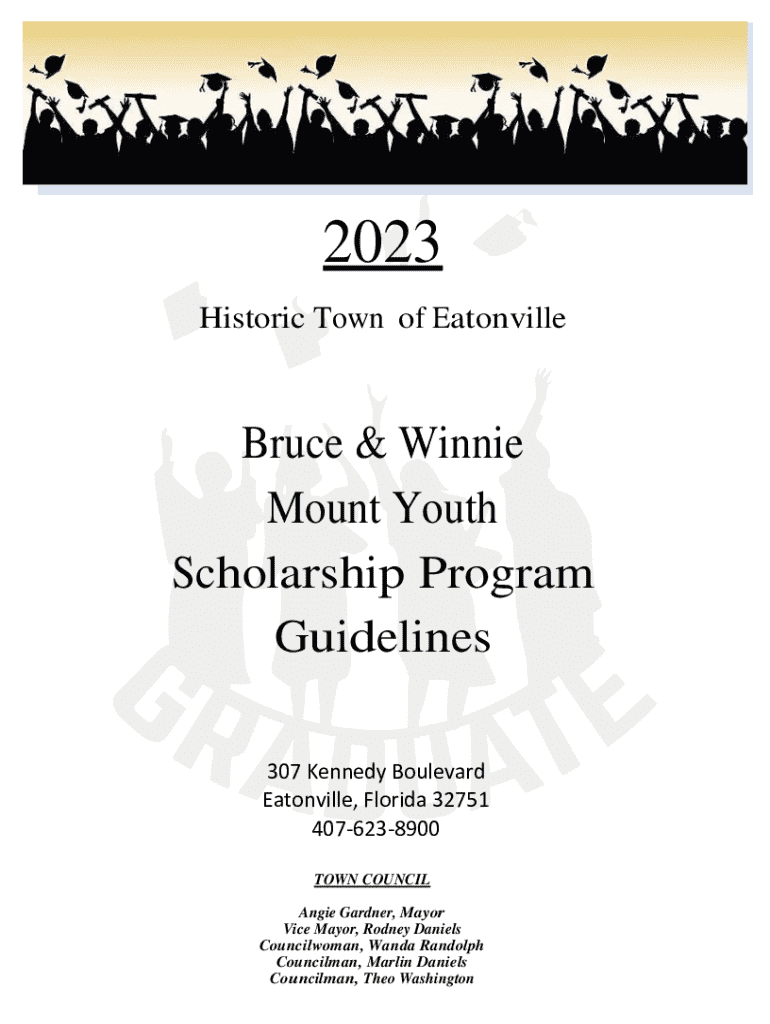 SUBMISSION DEADLINE: Monday, August 31, 20232023 Historic Town of EatonvilleBruce & Winnie Mount Youth Scholarship Program Guidelines 307 Kennedy Boulevard Eatonville, Florida 32751 4076238900 TOWN