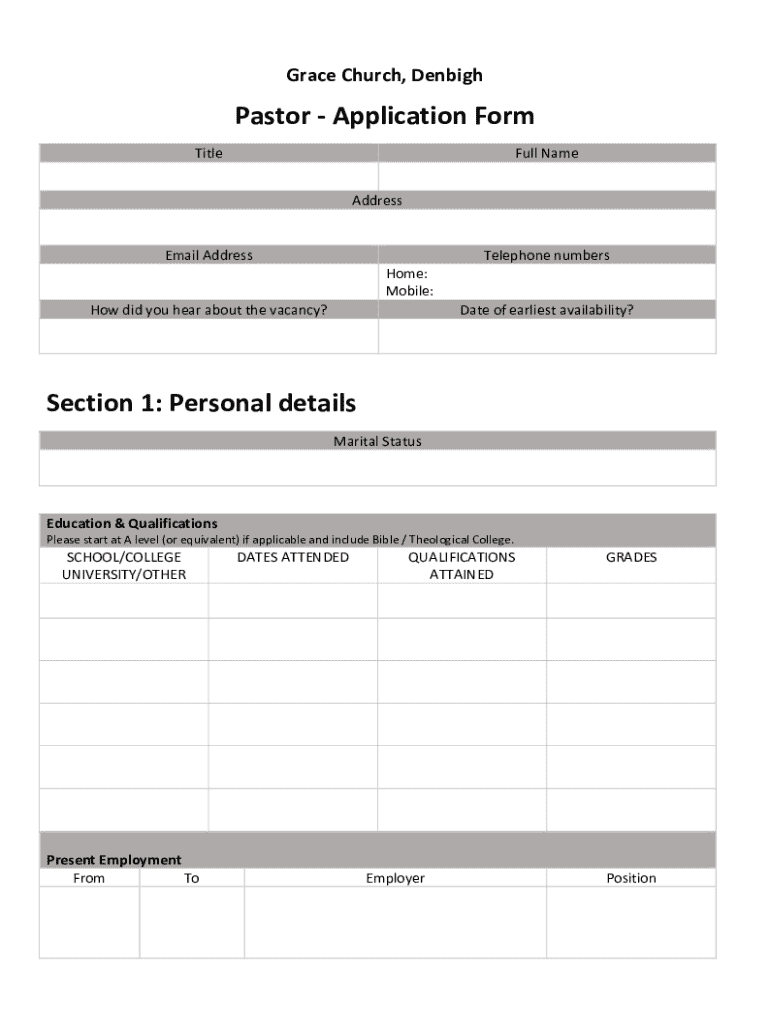 Grace Church, DenbighPastor Application Form TitleFull Name AddressEmail AddressTelephone numbers Home: Mobile:How did you hear about the vacancy? Date of the earliest availability? Section 1: Personal