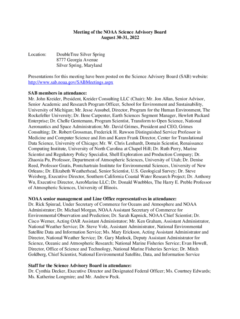 Meeting of the NOAA Science Advisory Board August 3031, 2022Location:DoubleTree Silver Spring 8777 Georgia Avenue Silver Spring, MarylandPresentations for this meeting have been posted on the Science