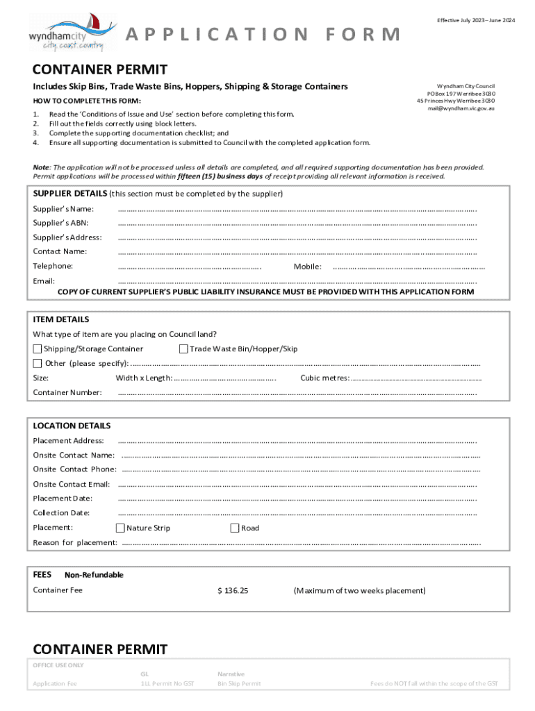 Effective July 2023 June 2024APPLICATION FORM CONTAINER PERMIT Includes Skip Bins, Trade Waste Bins, Hoppers, Shipping & Storage Containers HOW TO COMPLETE THIS FORM: 1. 2. 3. 4.Read the Conditions