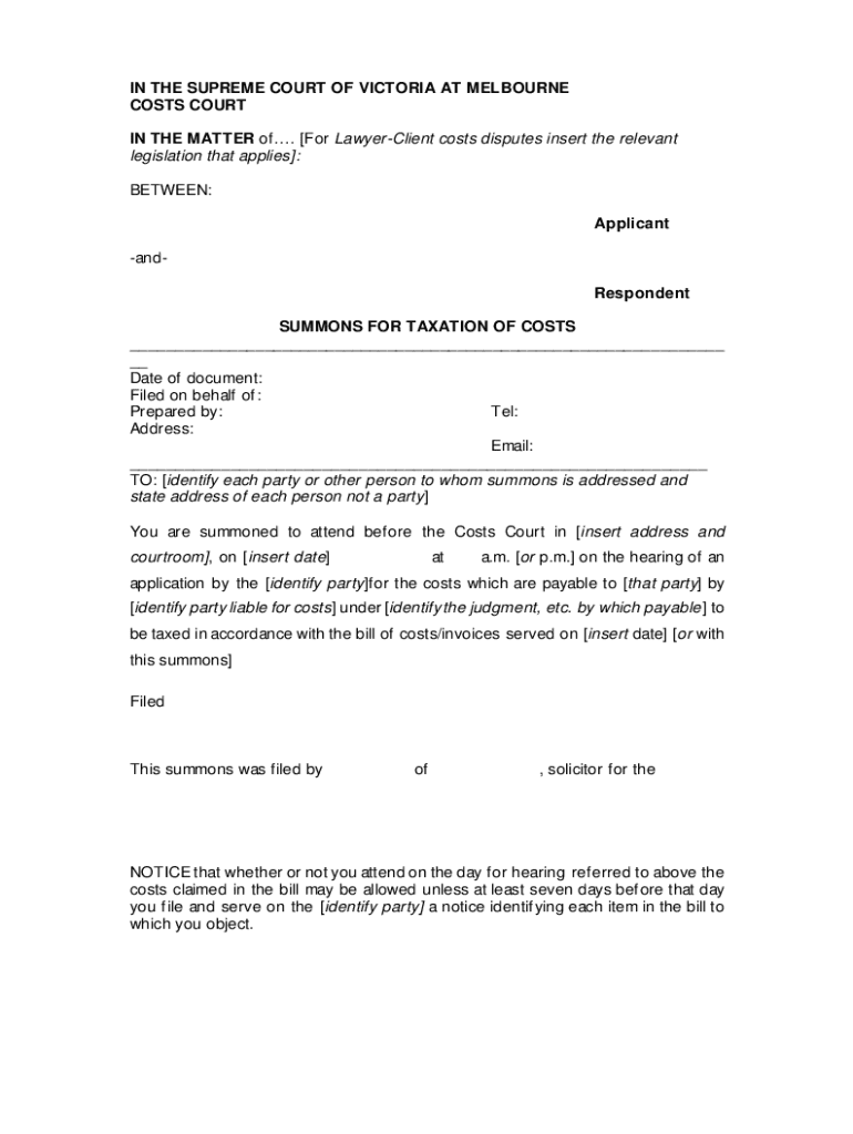 IN THE SUPREME COURT OF VICTORIA AT MELBOURNE COSTS COURT IN THE MATTER of. [For LawyerClient costs disputes insert the relevant legislation that applies]: BETWEEN: Applicant andRespondent SUMMONS