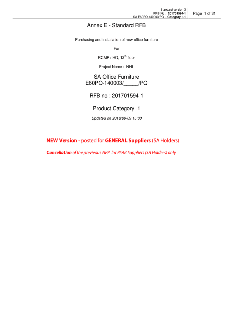 Standard version 3 ROB No : 2017015941 SA E60PQ140003/PQ Category : .1Annex E Standard ROB Purchasing and installation of new office furniture For RCMP / HQ, 12th floor Project Name : NHLPA Office