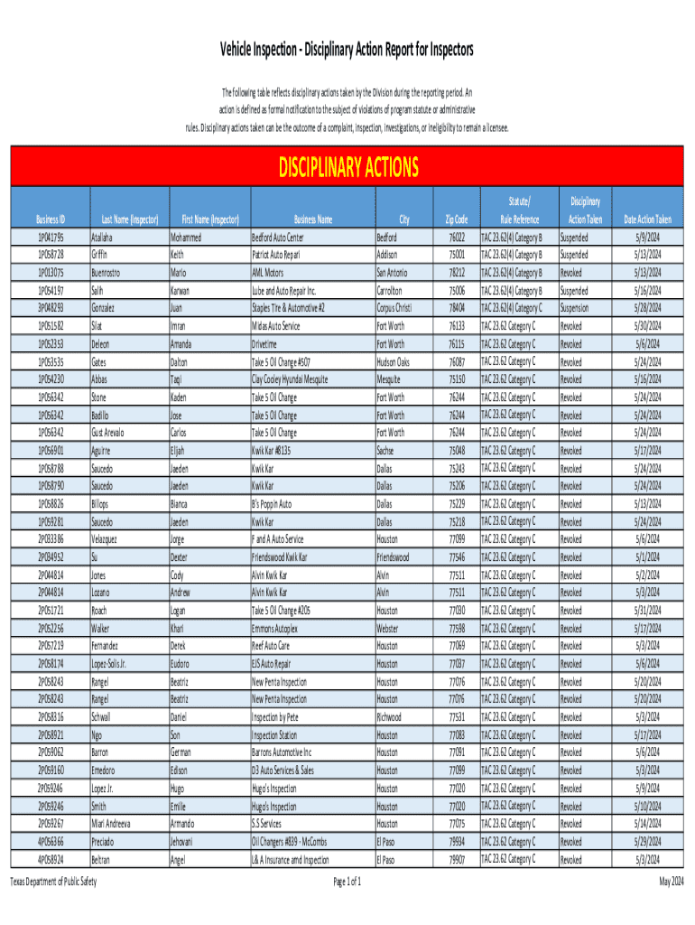 Vehicle Inspection Disciplinary Action Report for Inspectors The following table reflects disciplinary actions taken by the Division during the reporting period. An action is defined as formal notification