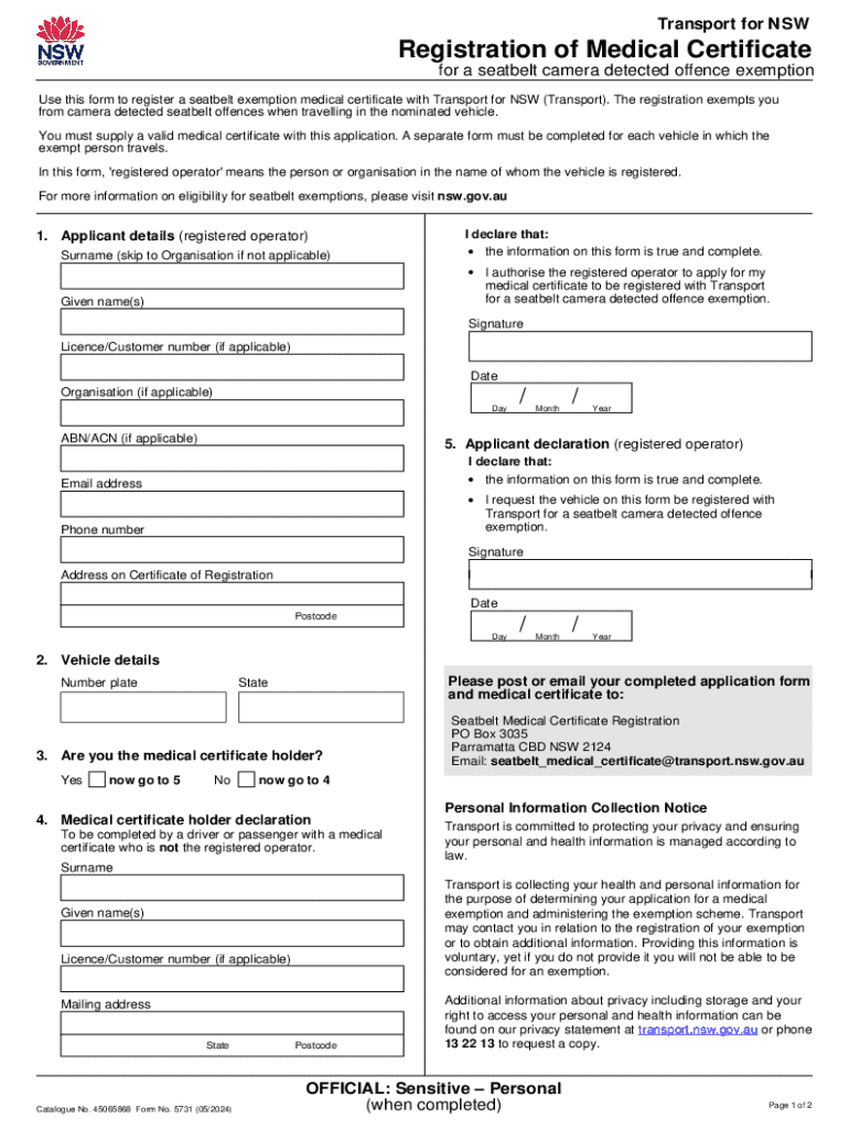 Transport for Registration of Medical Certificate for a seatbelt camera detected offense exemption Use this form to register a seatbelt exemption medical certificate with Transport for NSW (Transport).
