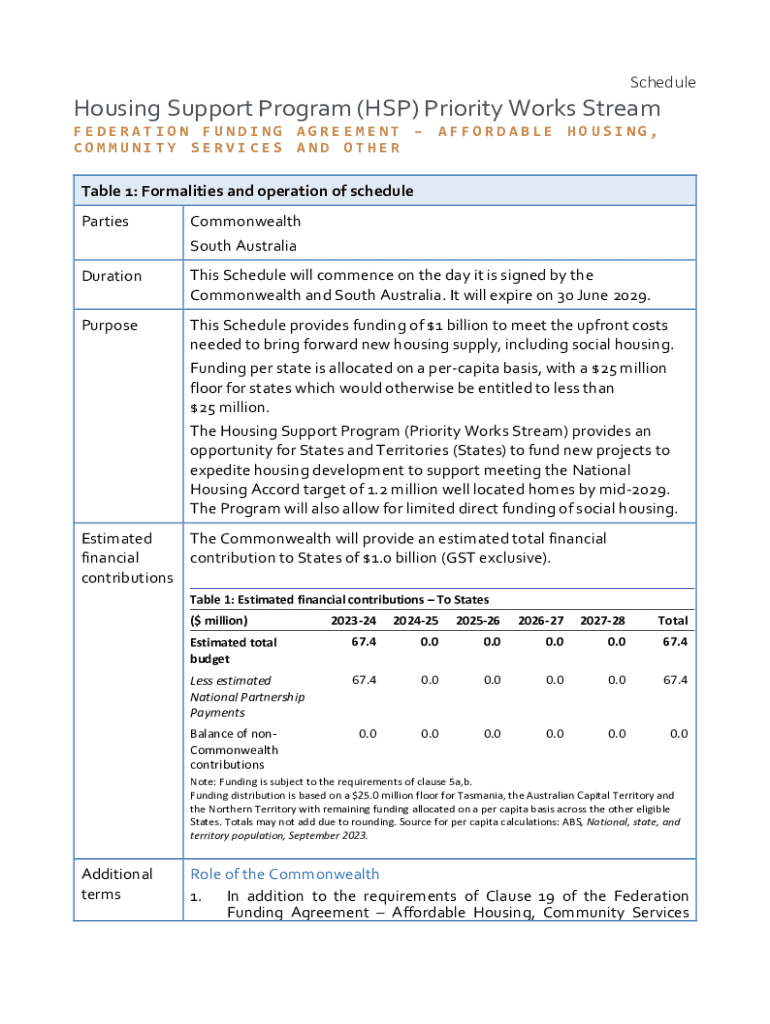 ScheduleHousing Support Program (HSP) Priority Works Stream FEDERATION FUNDING AGREEMENT AFFORDABLE HOUSING, COMMUNITY SERVICES AND OTHERTable 1: Formalities and operation of schedule PartiesCommonwealth