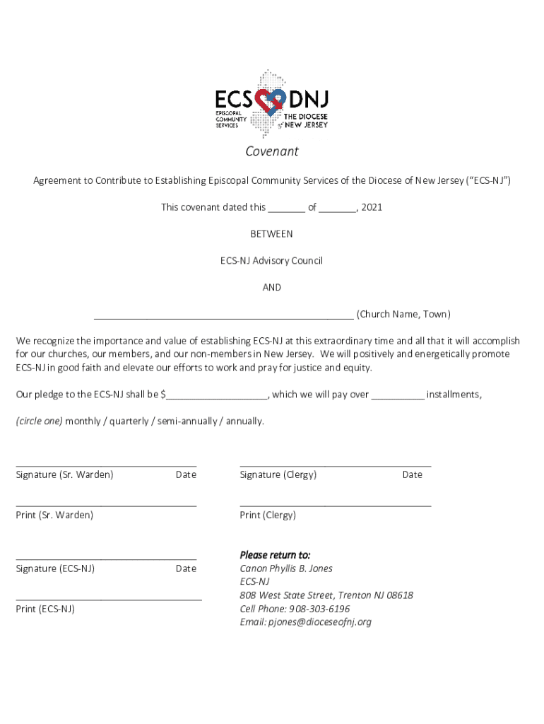 Covenant Agreement to Contribute to Establishing Episcopal Community Services of the Diocese of New Jersey (ECSNJ) This covenant dated this ___ of ___, 2021 BETWEEN ECSNJ Advisory Council AND ___