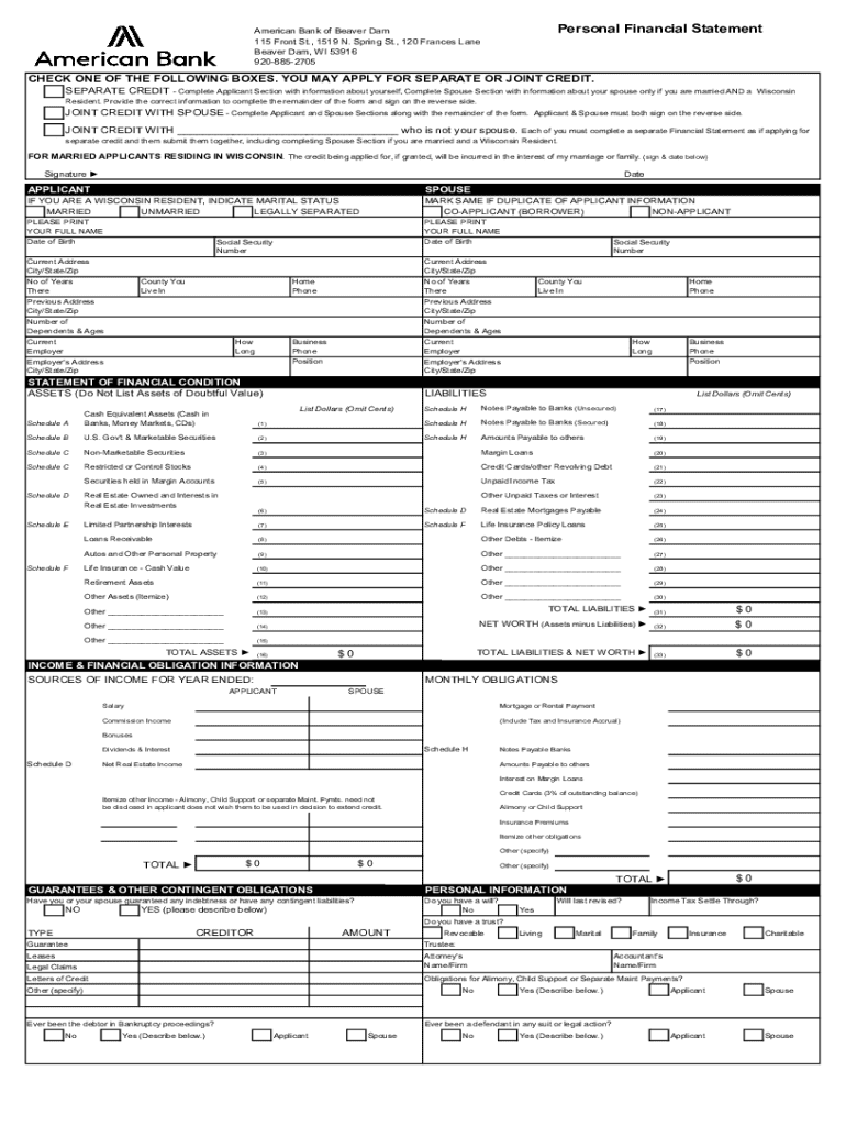 Personal Financial Statement American Bank of Beaver Dam 115 Front St., 1519 N. Spring St., 120 Frances Lane Beaver Dam, WI 53916 9208852705CHECK ONE OF THE FOLLOWING BOXES. YOU MAY APPLY FOR SEPARATE