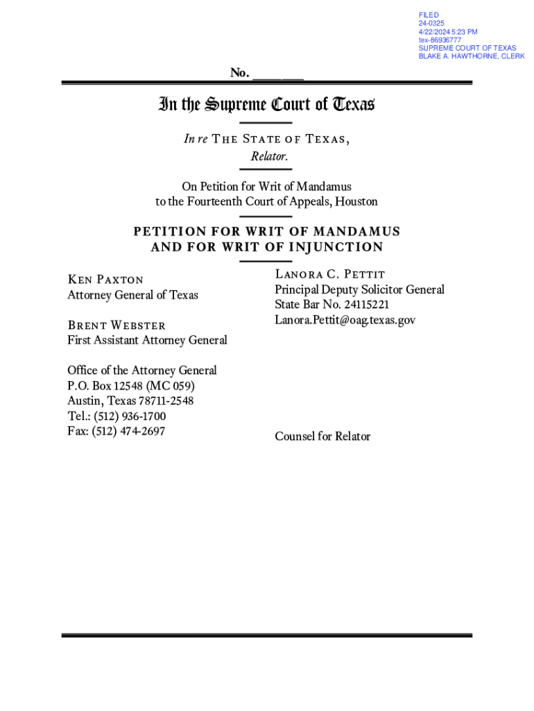 FILED 240325 4/22/2024 5:23 PM tex86936777 SUPREME COURT OF TEXAS BLAKE A. HAWTHORNE, CLERK No. ___In the Supreme Court of Texas In re The State of Texas, Realtor. On Petition for Writ of Mandamus