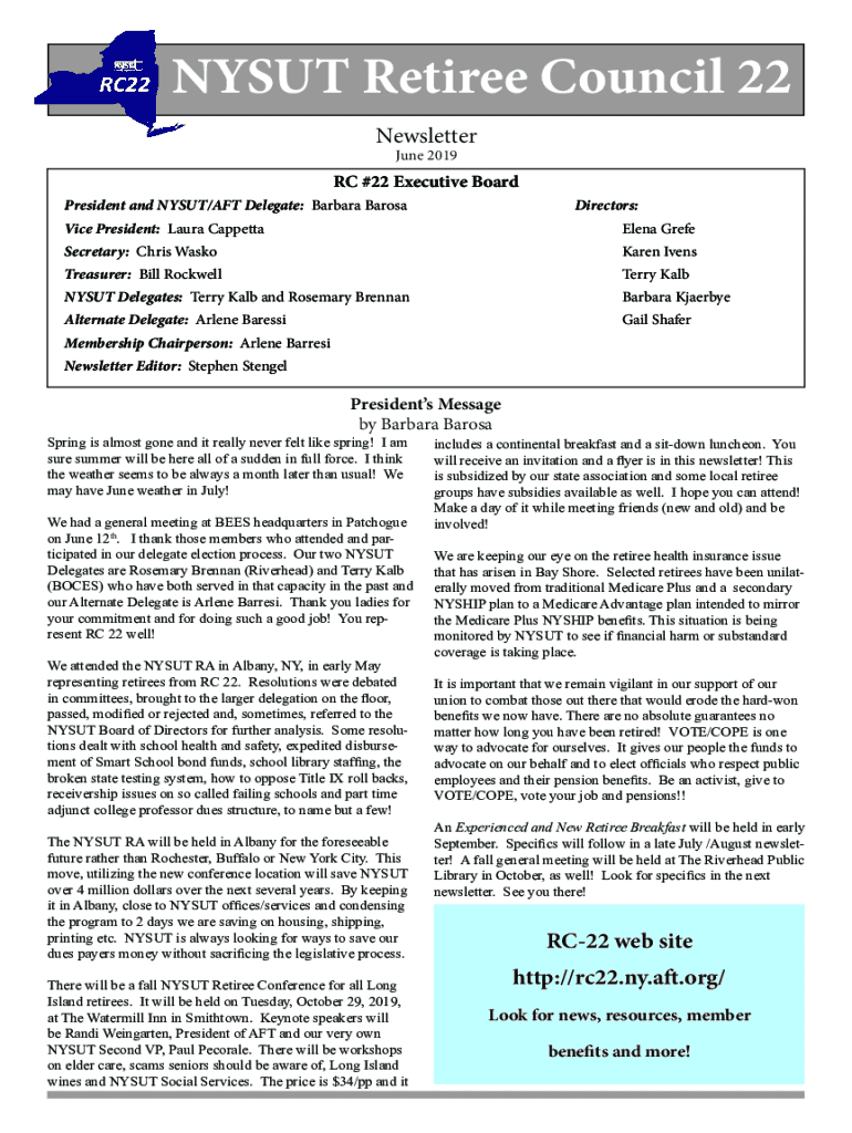 Get the free Newsletter - NYSUT Retiree Council 22AFT Stateweb