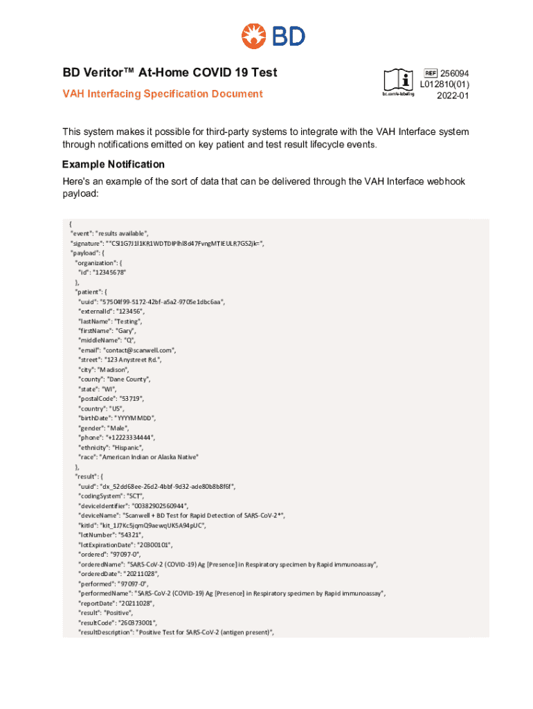 BD Veritor AtHome COVID 19 Test VAH Interfacing Specification Document256094 L012810(01) 202201This system makes it possible for thirdparty systems to integrate with the VAH Interface system through